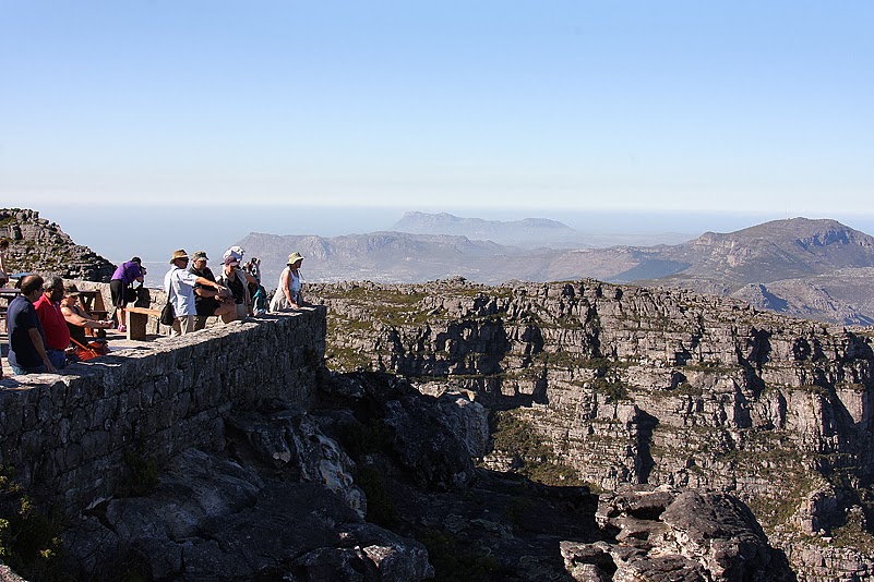 Dass das Wetter eine unerwartet positive Entwicklung genommen hat, merken wir aber leider nicht nur an der phantastischen Aussicht, sondern auch an der zunehmend größer werdenden Besuchermenge. Besucher, die tatsächlich den „langen“ Weg auf sich genommen haben, aber ebenfalls größtenteils von asiatischer Unruhe besessen scheinen! Was da nicht alles umherwuselt: recht betagte Herrschaften, die sich ohne Gehstöcke kaum noch auf den Beinen halten können, Herrengruppen mit mottobedruckten Vereins-T-Shirts, Familien mit gelangweilten Kindern, wie wahnsinnig knipsende Hobbyfotografen und eine Vielzahl von kaltblütigen Sehenswürdigkeiten-Abhakern. Kaum einer dieser Menschen scheint sich jedoch für das zu interessieren, was, in unseren Augen, eines besonders ausgiebigen Blickes würdig wäre – nämlich die einzigartige Tier- und Pflanzenwelt hier oben. Das ist zwar extrem bedauerlich und tut mir fast persönlich weh, könnte uns aber eigentlich weitestgehend egal sein, wenn da nicht eine Sache wäre: die Touris sind so im Tafelberg-Wahn, dass sie uns permanent Vögel und Eidechsen verscheuchen, ohne es überhaupt zu bemerken und, noch schlimmer, in einer Tour von den Wegen abweichen und somit auf den wundervollen Pflanzen herumtrampeln. An einem Ort wie diesem jedoch ist das wohl leider der Normalzustand, der sich heute sicher noch in abgeschwächter Form präsentiert. Ich mag mir gar nicht vorstellen, wie das in der Hochsaison ist… Doch nein, ich bin schon wieder undankbar! Wir sind hier auf dem Tafelberg, DEM Besucherziel Kapstadts, und dürfen uns alleine dafür glücklich schätzen, ganz besonders aber auch für unsere relativ einsame Zeit hier oben. So also entfurche ich meine Stirne, die sich gerade vor Unmut über die Anwesenheit eines vorübertrampelnden, schwedischen Kegelclubs in albernen Vereins-Leibchen in tiefe Falten legen will und verinnerliche stattdessen das bisher Gesehene. Om! So fühle ich mich gleich relaxter und kann das nun Folgende weiter genießen: die Sonne steht schon recht hoch und wir machen uns auf den Weg zurück zur Gipfelstation, wo jetzt recht reges Treiben herrscht.